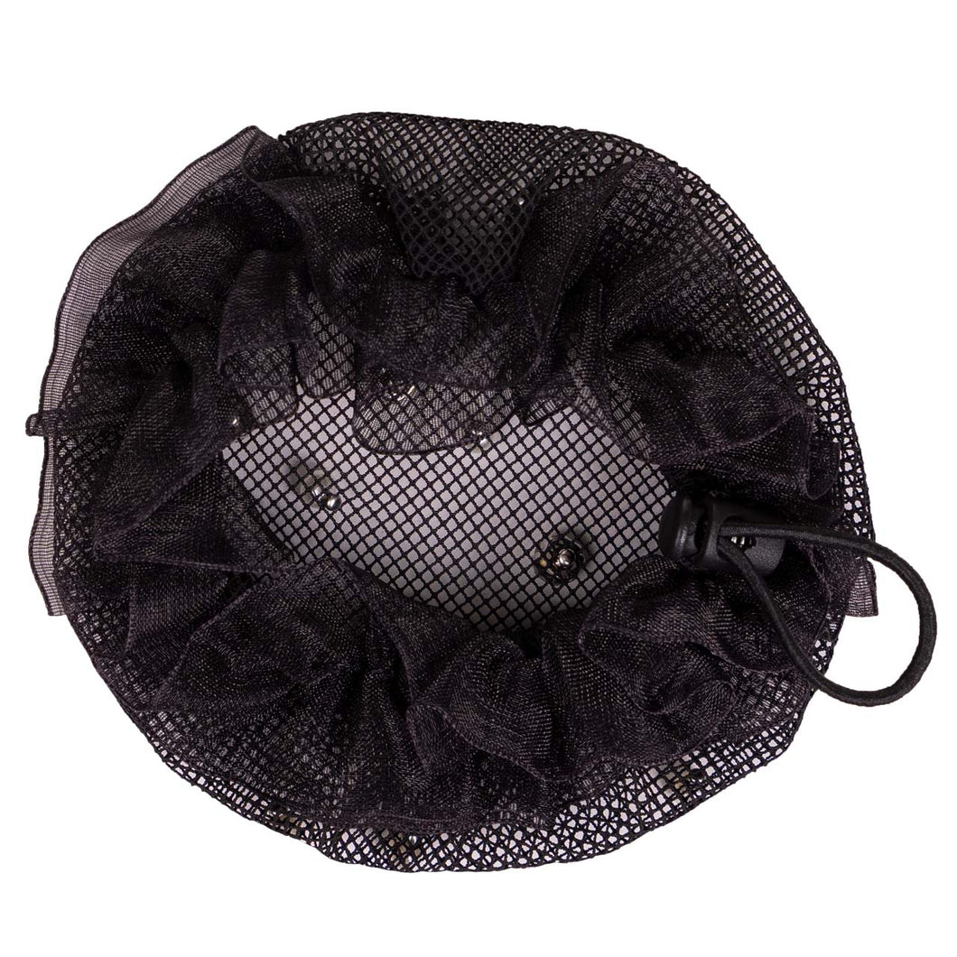 This fine mesh hair net is decorated with elegant rhinestones and pearls. The ruffle around the elastic gives the hairnet a chic look. The elastic ensures that the hairnet can be made to fit around your bun.