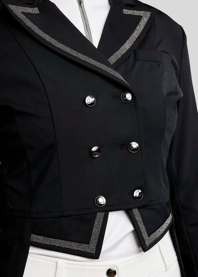 Elegant Design: This long-tail competition jacket is adorned with beautiful gun metal caviar tape details, adding a luxurious touch to its overall appearance. The gun metal buttons complete the sophisticated look, while the long silhouette adds a touch of timeless elegance.