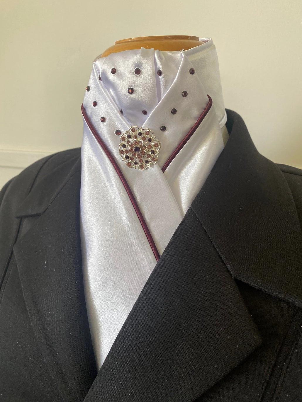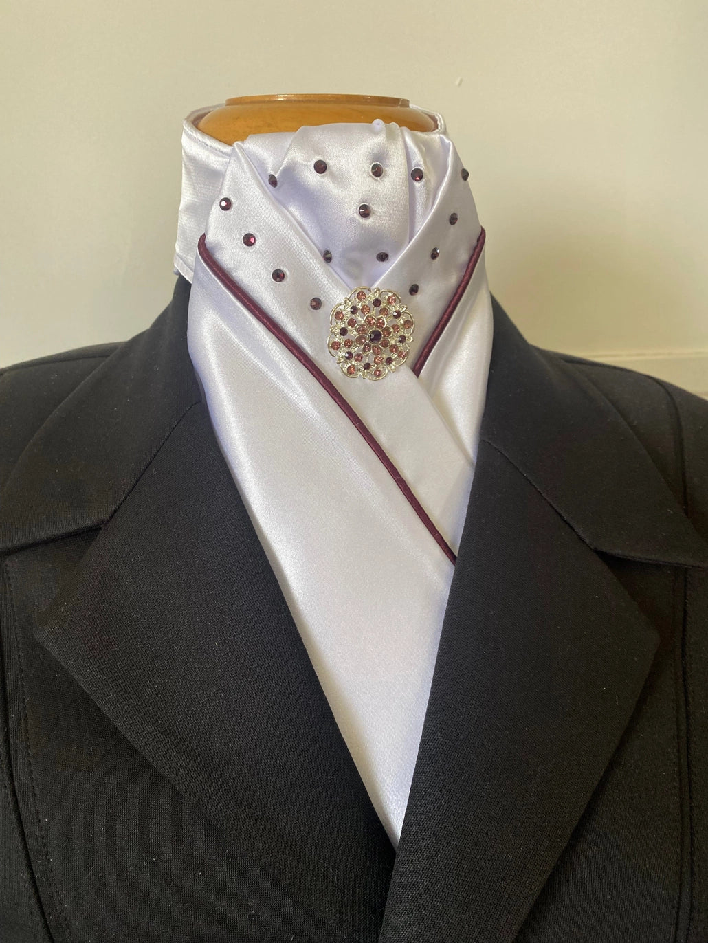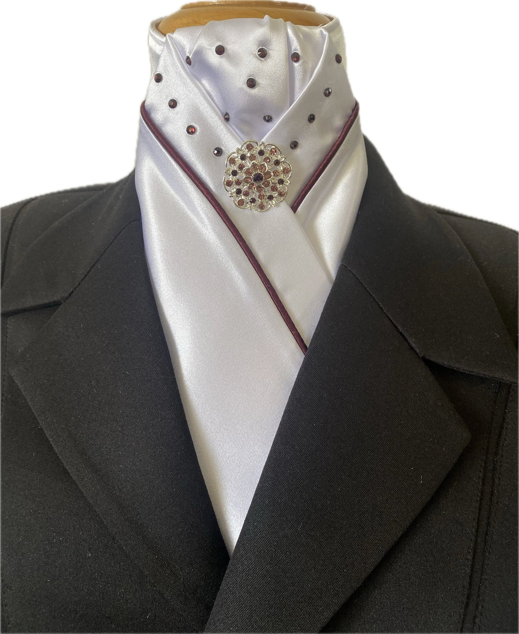 The HHD Custom Dressage Pre tied Stock Tie in white satin with Burgundy Piping and Swarovski Elements