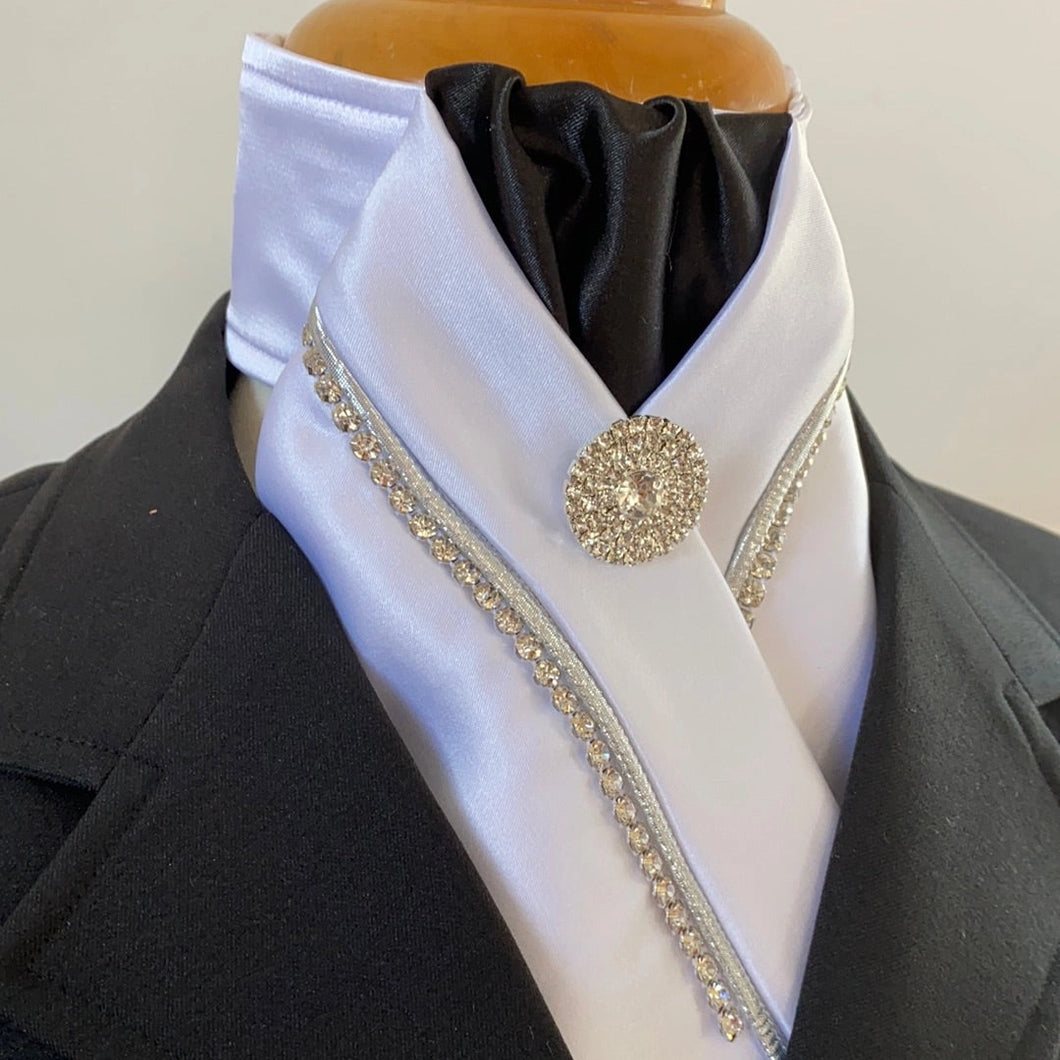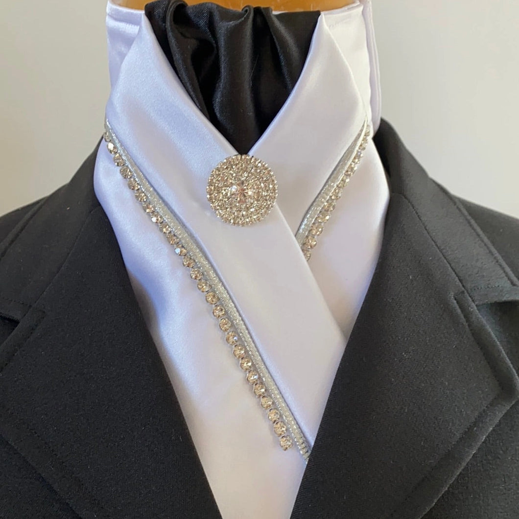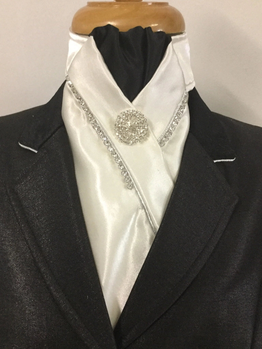 HHD white Satin stock Tie with crystals and black piping, silver rhinestone stock pin included.